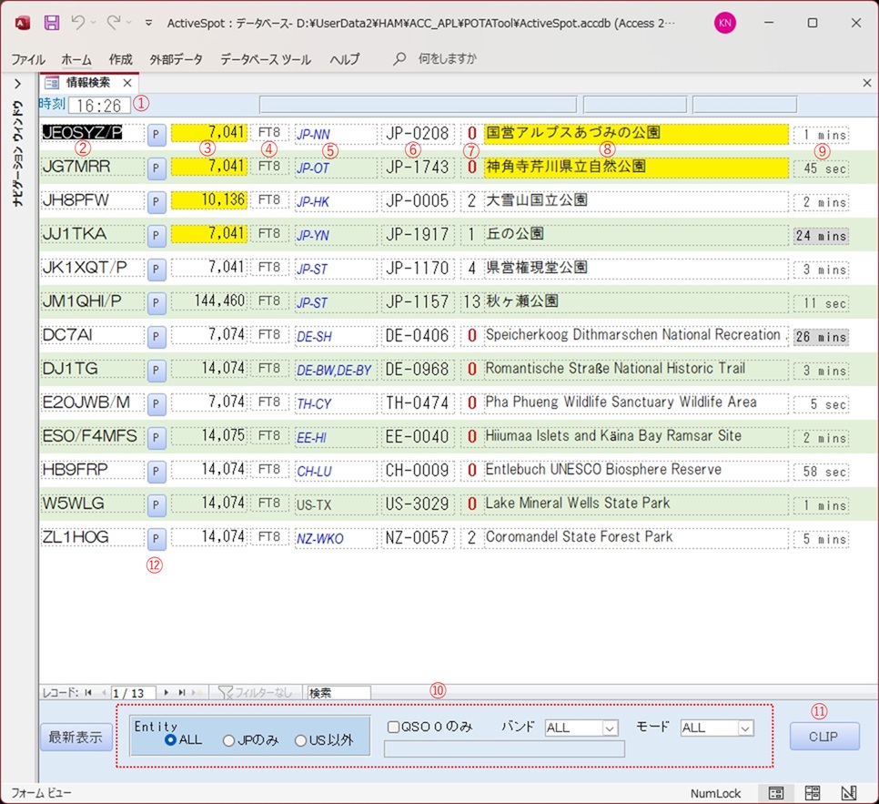 ⑪ | CLIP | 画面に表示しているコールサインをクリップボードへコピー (JTDX用) |