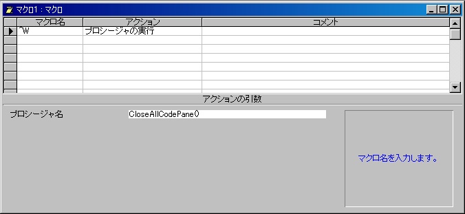 Access の AutoKeys マクログループを利用し、キー操作でこのプロシージャを起動するようにします。